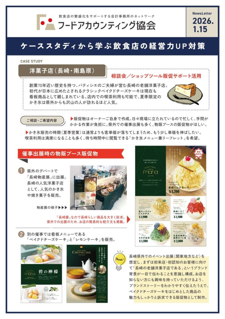 税理士法人 KJグループが飲食店経営者に向けてお届けする「集客・売上・利益アップ情報」。飲食店経営者の方は必須です。 2025年11月15日飲食店の販売促進ケーススタディ【vol.25.1115】 2025年9月15日飲食店の販売促進ケーススタディ【vol.25.0915】 2025年7月15日飲食店の販売促進ケーススタディ【vol.25.0715】 2025年5月15日飲食店の販売促進ケーススタディ【vol.25.0515】 2025年3月18日飲食店の販売促進ケーススタディ【vol.100】 2025年2月18日飲食店の販売促進ケーススタディ【vol.99】 2025年1月21日飲食店の販売促進ケーススタディ【vol.98】 2024年11月19日飲食店の販売促進ケーススタディ【vol.97】 2024年10月16日飲食店の販売促進ケーススタディ【vol.96】 2024年9月18日飲食店の販売促進ケーススタディ【vol.95】